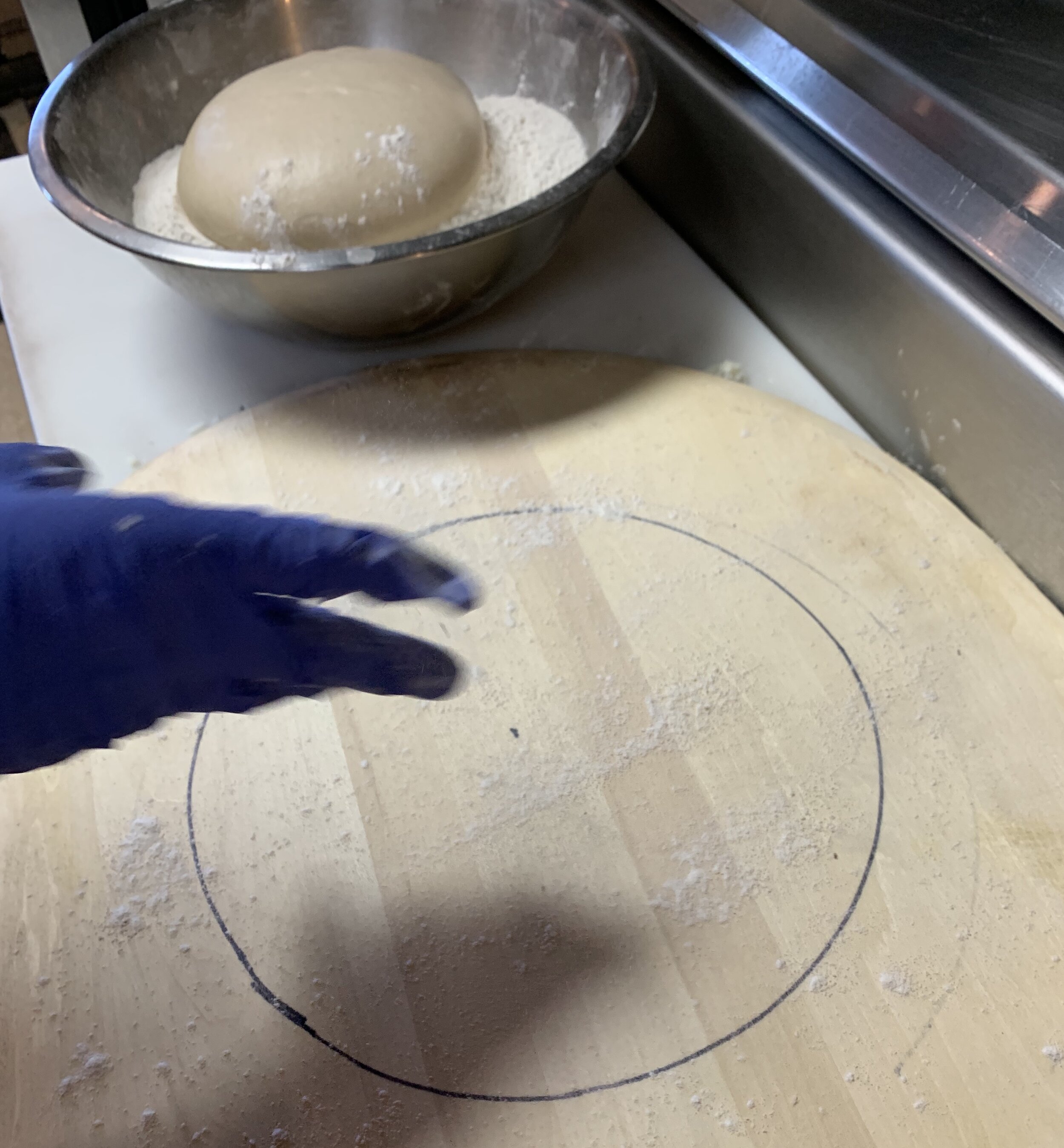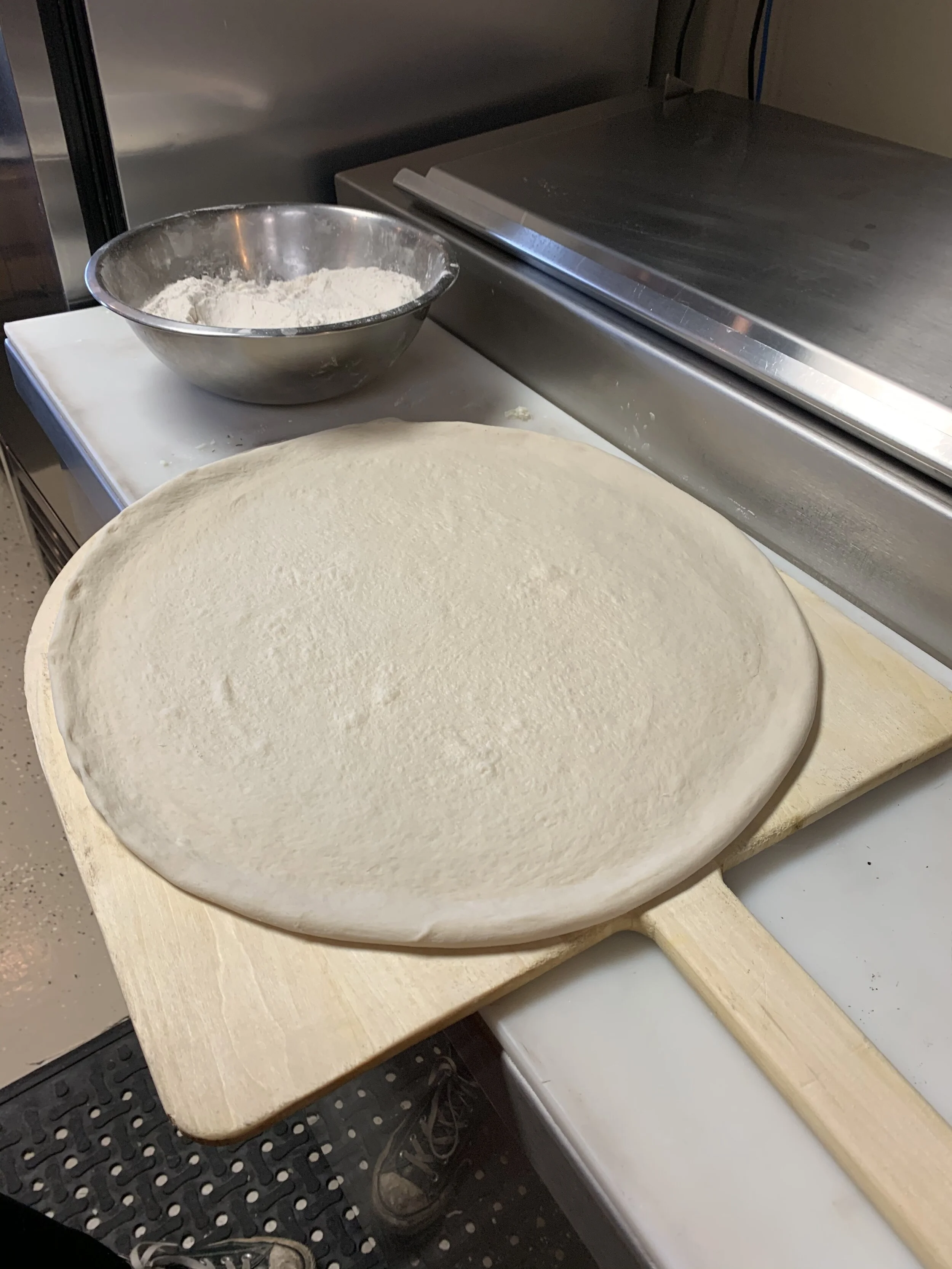 Place your stretched dough onto a pizza peel or any floured flat and sturdy surface.