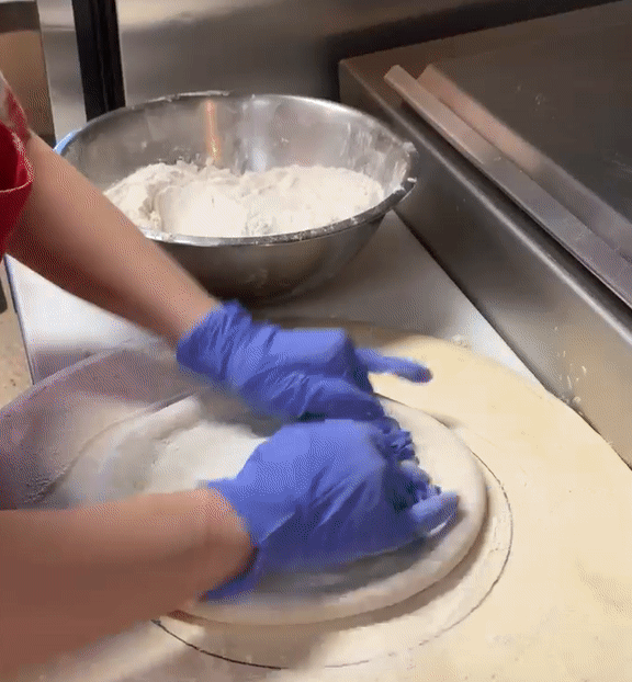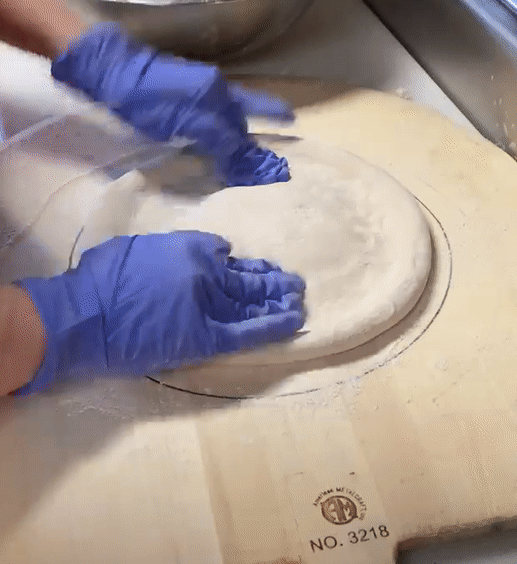 Pick up the dough and gently stretch the edge of the dough. Each time you gently stretch the dough, turn the dough slightly to stretch another area. This will prevent any holes tearing in the dough.